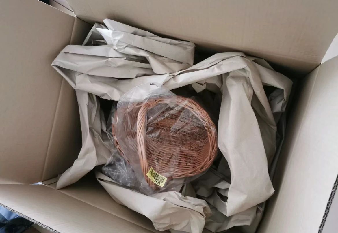 巨大的箱子里只有一个篮子,满满的牛皮纸,目测放5个篮子都没问题