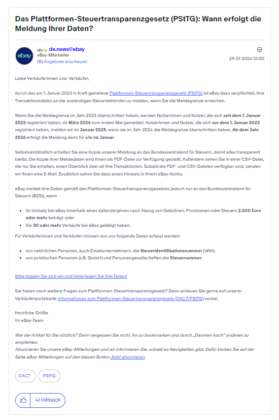 AMZ123获悉,近日eBay德国站发布公告提醒卖家,欧盟《平台税收透明法》(Plattformen-Steuertransparenzgesetz) 已于2023年1月1日生效,根据规定,eBay必须向德国联邦中央税务局报告卖家的收入。