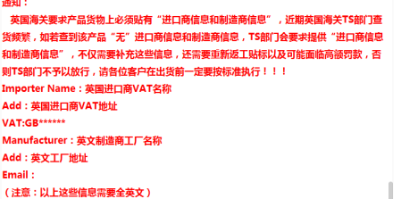 信息显示:英国海关要求产品货物上必须贴有“进口商信息和制造商信息”,近期英国海关TS部门查货频繁,如若查到该产品“无”进口商信息和制造商信息,TS部门会要求提供“进口商信息和制造商信息”,不仅需要补充这些信息,还需要重新返工贴标以及可能面临高额罚款,否则TS部门不予以放行。