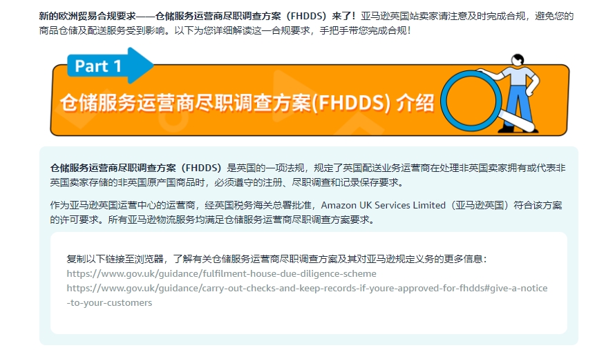 FHDDS要求亚马逊在了解或有合理理由怀疑卖家未遵守英国增值税规定或未履行海关义务时通知英国税务海关总署(HMRC),同时欧洲时间6月30日起亚马逊可能需要终止为您提供的相关商品仓储及配送服务。