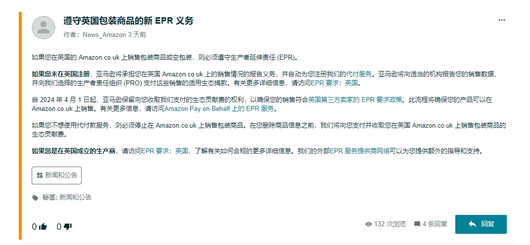 在2月初,亚马逊英国站也发布EPR合规要求公告:如果您在英国的 Amazon.co.uk 上销售包装商品或空包装,则必须遵守生产者延伸责任(EPR)。