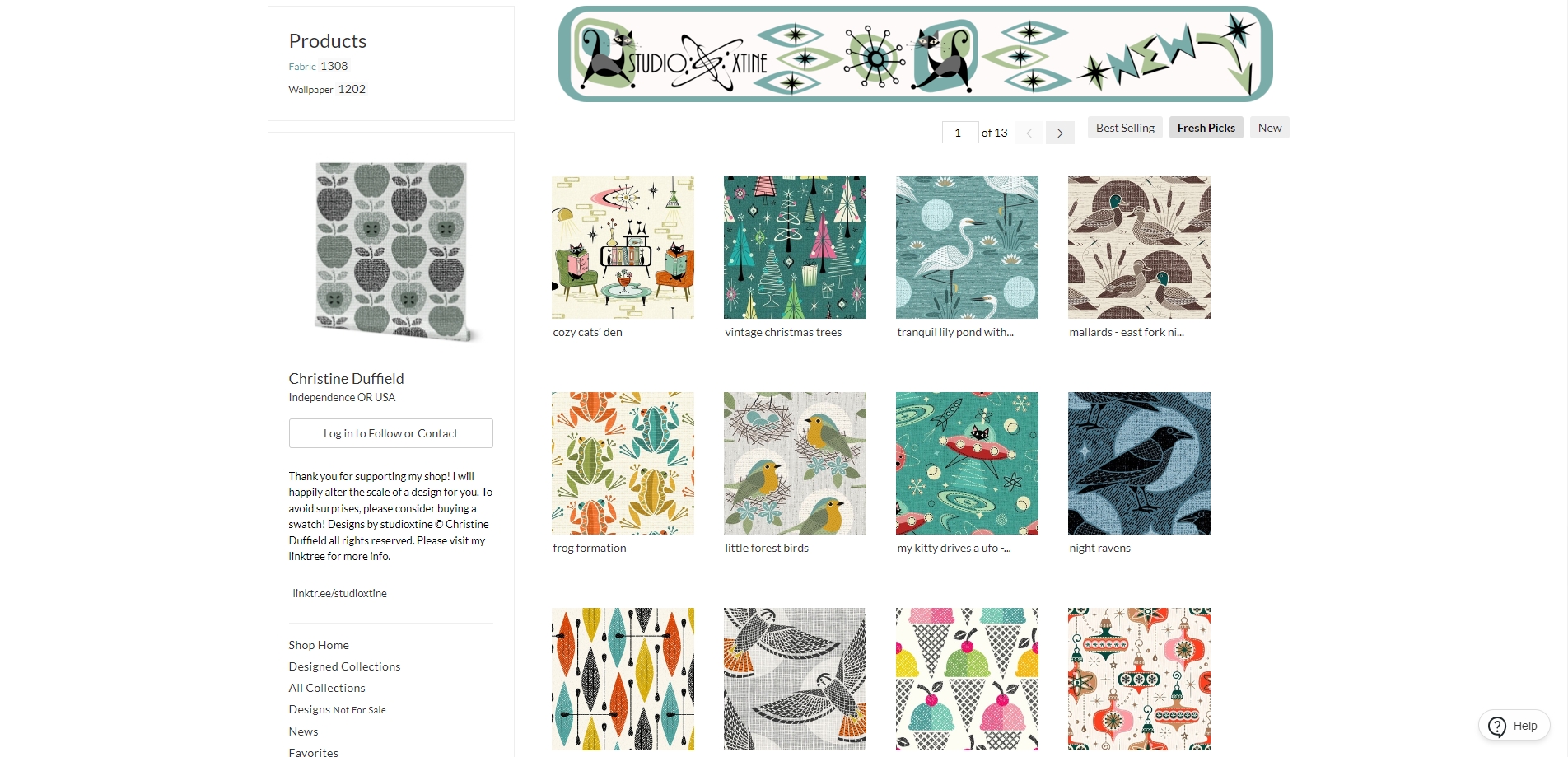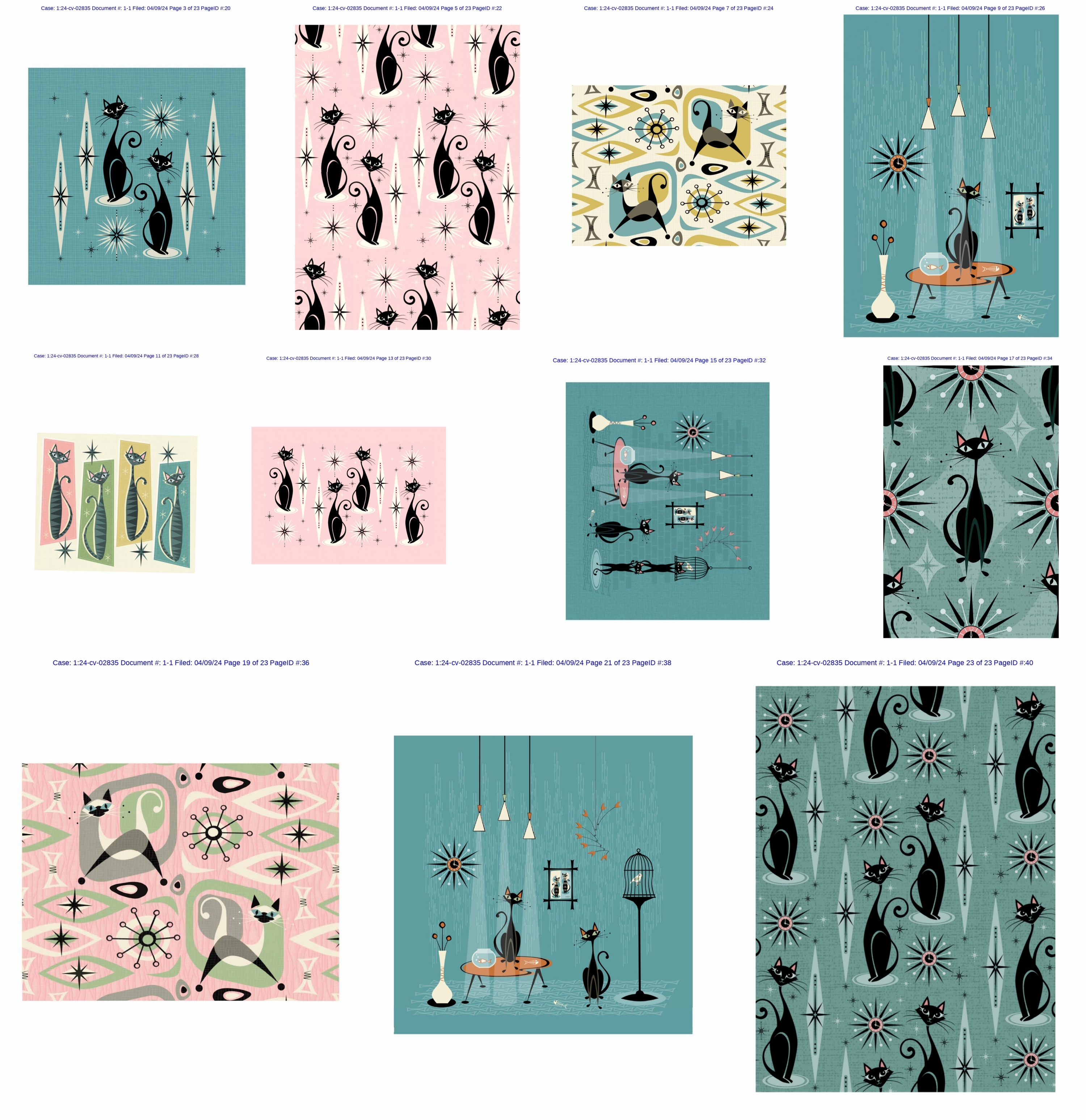 原告方:Christine Poppy DuffieldChristine Poppy Duffield是Xtine工作室的艺术家,也是Spoonflower的获奖设计师,专注于表面图案设计业务,作品以原创的手绘矢量插图为主。Duffield笔下的插图结合了中世纪的现代艺术,将猫猫、原子、几何、装饰艺术等元素组合在一起,展现出符合现代气息的复古色彩。
