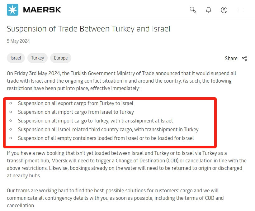 由于土耳其政府贸易部宣布,该国境内及周边地区持续发生冲突局势,将暂停与以色列的所有贸易,5月5日,马士基官网发布暂停以色列进出口贸易、转运和订舱通告。