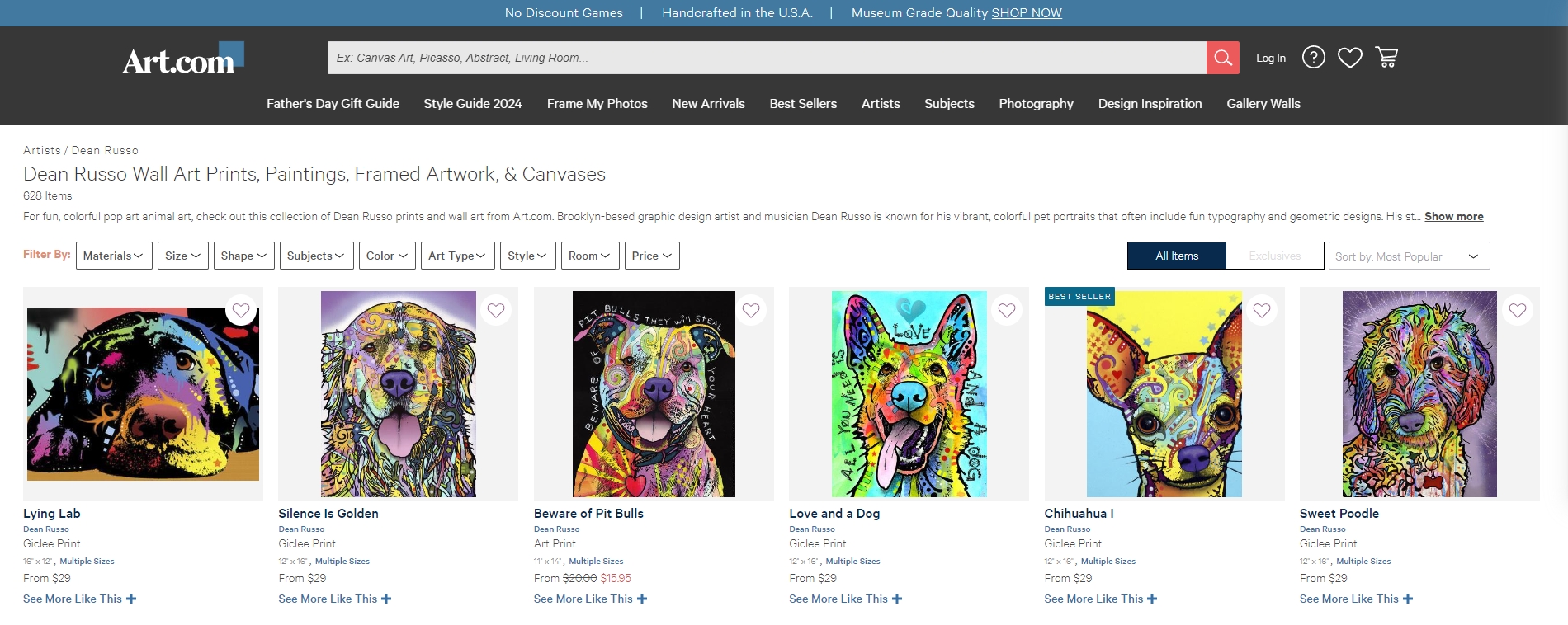 Russo在一个充满艺术用品的家庭长大,从小就开始画卡通人物,这对他后来的作品产生了很大的影响。在视觉艺术学院和普拉特学院学习平面设计和美术后,他开始主要画名人肖像,但他的两只雄鸡成了他最大的灵感来源。因此,他的主要主题是狗与比特犬代表了他的大部分工作。