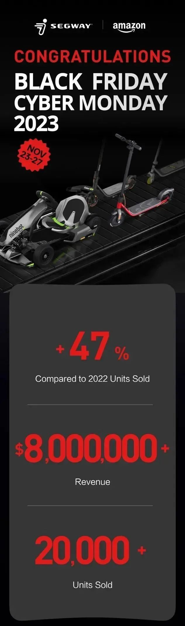 在2023年“黑五网一”档期过后,九号公司发布了宣传海报,公司在官方商城和亚马逊旗舰店,全网线上销售额超800万美元,电动滑板车、电动卡丁车等短交通产品销量超2万台,同比增长47%,销售表现创新高。