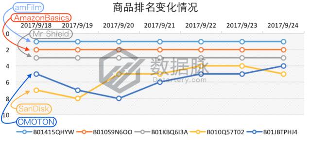 可以看到,在上周Cell Phones & Accessories品类的Best Seller榜单中,除了榜单“三大天王”——amFilm手机屏保护膜、AmazonBasics数据线、Mr Shield手机屏保护膜、SanDisk内存卡继续占领综合排名前四名之外,一款品牌为OMOTON的iPone 7手机屏保护膜也有不错的榜单表现。骆探长(shujumai.com)发现,该款手机屏保护膜产品自2017年9月20日开始,榜单排名持续上升,在5天中有榜单第8成 功跻身榜单前四,后续市场表现值得关注。