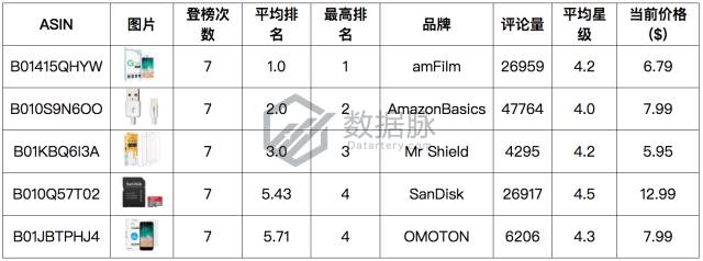 根据上周Hot New Releases榜单上商品的登榜次数及平均排名,骆探长对登榜的商品进行了排序,其中排名靠前的五款商品如下所示: