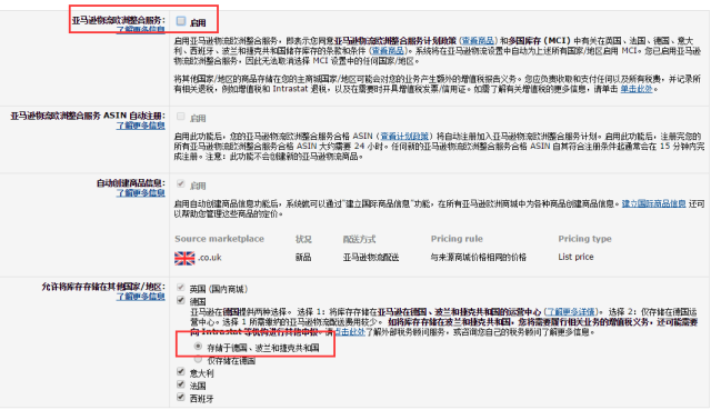 2.点击“编辑”后,如果亚马逊物流欧洲整合服务勾选启用,我们会在“允许将库存存储在其他国家/地区”里看见各国的选项,其中德国有两个勾选对象。参加中欧计划的,需要勾选第一个。不想参与中欧计划,选第二个。