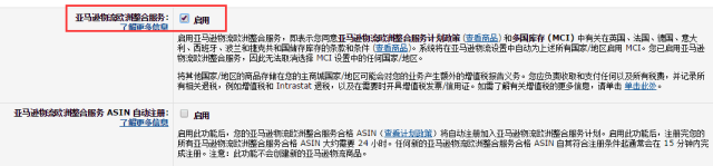 3.最后回到亚马逊物流欧洲整合服务勾选启用。如果是亚马逊自动为你的账号设置了中欧计划,当你点开“跨境物流设置”事,就会直接出现此内容。