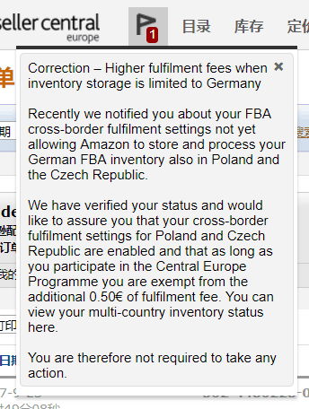 如果不参与中欧计划的卖家,即同意亚马逊把在德国的FBA库存储备在亚马逊的其他物流网络中心(包括波兰和捷克共和国),从德国物流中心运出的每个FBA产品将收取额外的0.25欧元。但自2017年4月11日起,此费用将增加至0.50欧元。有关详细信息,请参阅FBA定价页面。