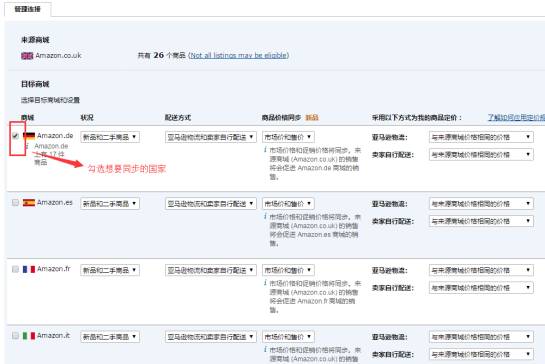 (3)以下页面信息,来源商城为英国站,有26个商品,目标商城就是被同步过去到哪个站点。勾选想要同步的站点,可以是一个,也可以是全部。