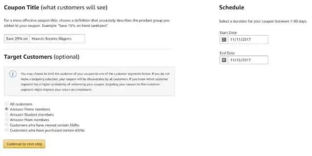 5. 然后点击“next step”设置折扣券名称,有效期,以及针对人群