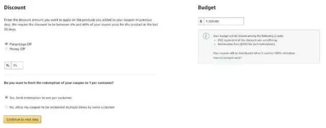4. 然后点击“next step”进入折扣和预算设定页面,进行折扣和预算设定,以及勾选一个卖家是否可以收藏多张相同的折扣券
