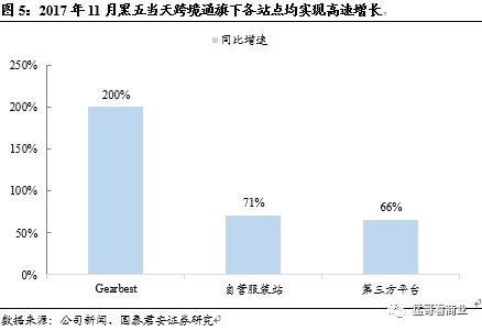 公司旗下自营电子站Gearbest月均流量持续上升,10月环比+1.15%至1.61亿;服装站Zaful10月流量环比+33.26%,以色列市场相较9月增长3倍以上。根据自营平台流量数据好转趋势,我们预计公司10月销售增速回升至80%,黑五当天子公司环球易购整体销售额同比+116%,其中Gearbest同比+200%,自营服装站同比+71%,第三方平台同比+66%;新兴市场增长最突出,沙特地区同比+1229%。