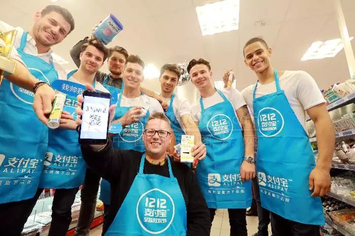当地时间12月11日,德国“网红”阿福(前排中)在法兰克福市中心一家Rossmann日化连锁为“双12”促销活动助阵。受到中国国内民众欢迎的“双12”购物狂欢今年由支付宝引入德国。