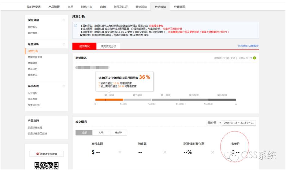 数据纵横里成交分析力可看到我们各自店铺的客单价(Nancy的新店铺暂没有确认收货订单所以这一栏暂时没显示哦)。