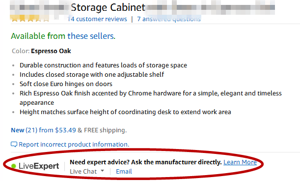 昨天,有卖家发现美亚站部分产品详情面多出一项显示内容“LiveExpert”,并有提示:需要专家意见吗,你可以在这里直接问制造商↓↓