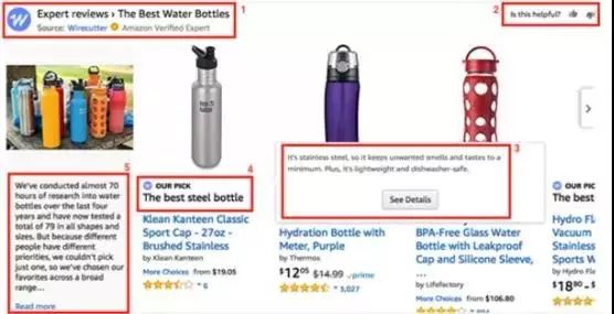 说完对销量大有裨益的Amazon's choice,我们再来讲讲新出现的“Expert Reviews"。小辣翅个人感觉新出的标识其实就是Expert's choice,专家的选择哈哈。目前应该还是没有全面开放,暂出于测试阶段?用相同的方法,输入“Water Bottles”后,小辣翅并没有看到所谓的“Expert Reviews"。尝试搜索了几种不同类目的商品后,均得出一致结果。不过放出消息的卖家有图有真相,据称该标识是出现在付费广告下方,为蓝底W标。来源显示Wirecutter,经查实这个Wirecutter先生是New York Times(纽约时报)旗下一家公司。