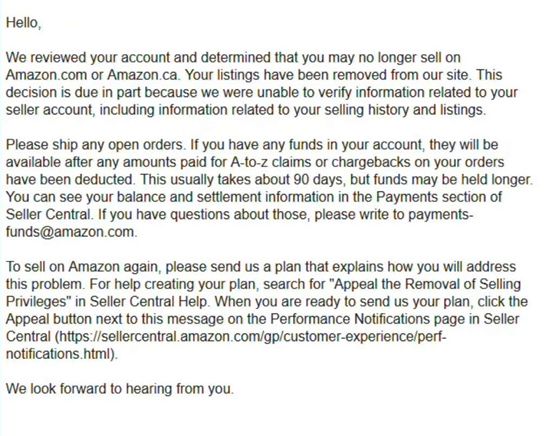 This decision is due in partbecause we were unable to verify information related to your seller account,including information related to your selling history and listings.