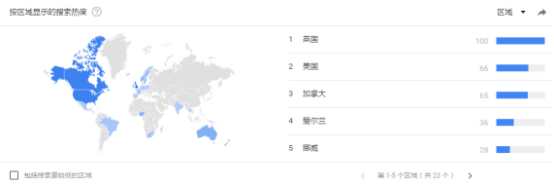 其中,搜索“fingerlings”热度最为活跃的国家分别是英国、美国、加拿大、爱尔兰和挪威。