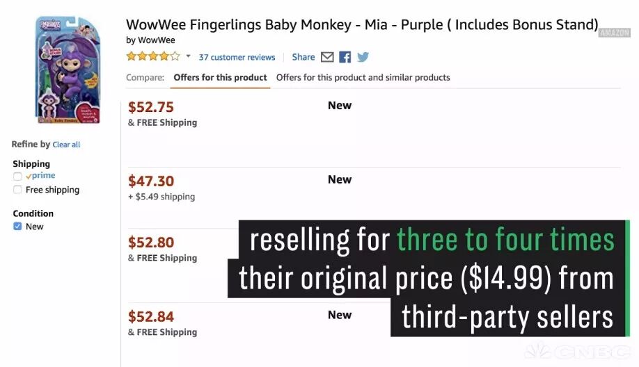 据《纽约时报》报道,指尖猴爆红之后“一猴难求”,可能由于一些网购工具和软件的介入,指尖猴子新品一上线就被迅速回购,导致eBay和亚马逊上的第三方销售商的产品价格已经超过产品原价的三到四倍。