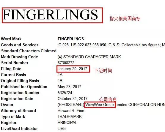 目前WowWee公司已经注册了上图与指尖猴子有关的商标,美国和欧盟商标都已经下证。
