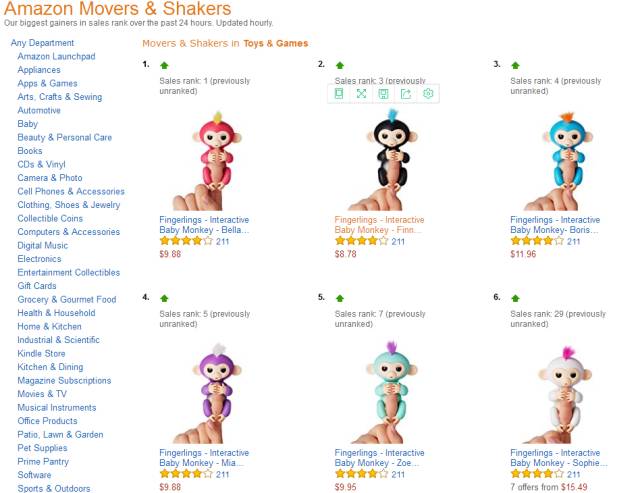 美亚Toys & Games飙升榜中前6位全部是指尖猴子,飙升排名前20位中有10位被指尖猴子占据……