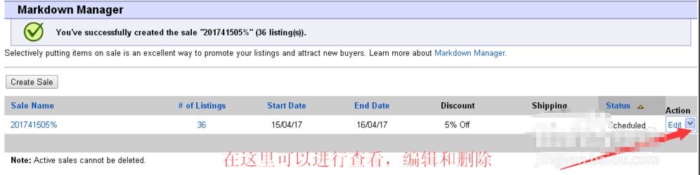 9. 提交完活动后,我们回到了markdown manager 这个页面,如果需要对活动进行修改,我们可以点击 edit。在edit 这个位置,还有一个view lisings,我们可以查看已经添加到活动中的具体产品。