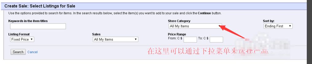 6. 我们可以通过对店铺不同产品的分类来进行筛选产品,也可以通过设置价格范围来找产品并添加。