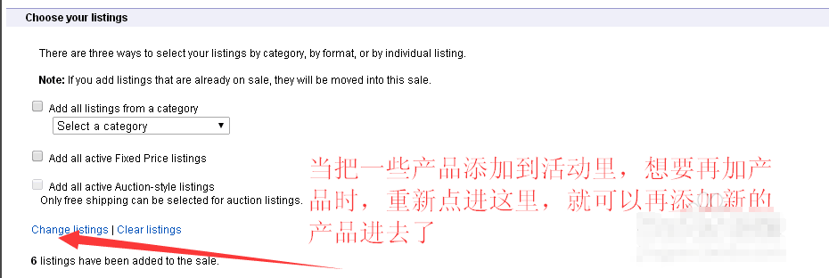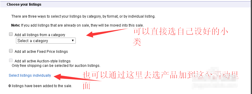 第一是按照一个类目所有产品添加,第二个是所有固定价链接,第三个是包邮的拍卖链接。选择蓝色英文字体一栏,在这里,我们点进去,可以随意添加我们想要打折的产品。