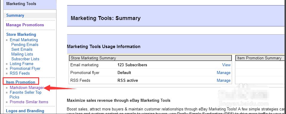 2. 点进marketing tools之后,我们可以看到在左侧栏有个Item Promotion, 在这个Item Promotion下面,选择 Markdown Manager。