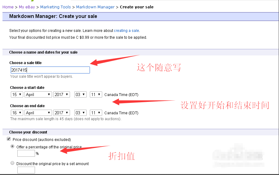 4. 开始设置活动标题和活动开始时间,结束时间,以及折扣力度。比如,标题可以写日期然后加上折扣,如 “2017041705%”