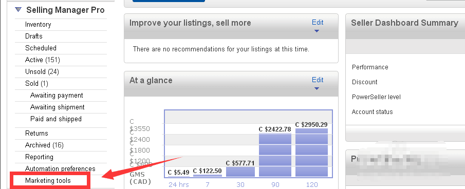 1. 登陆卖家账号,进去ebay店铺的后台操作中心,我们可以看到在左侧侧边栏的位置有打折工具。