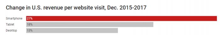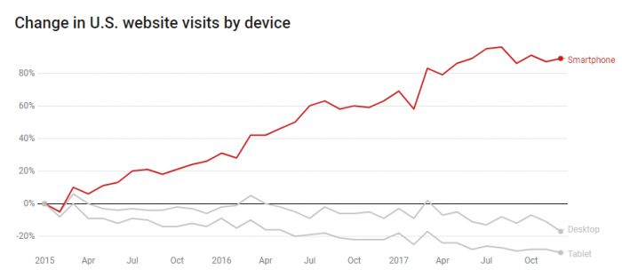 自2015年1月以来,美国的智能手机网络访问量增长了近90%,而平板电脑和台式电脑的流量却有所下降。移动端消费增长速度远远超过桌面或平板电脑。