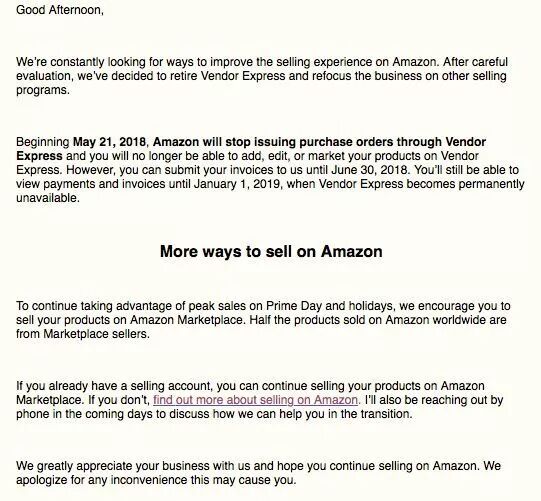 电子邮件里表示:“我们一直试图改善亚马逊的销售体验。经过认真评估后,我们决定关闭Vendor Express,并将业务重点放在其他销售计划上。”