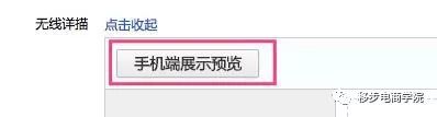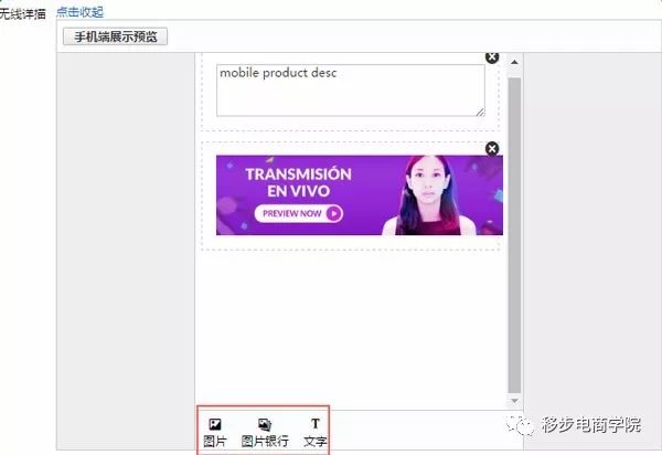 无线独立详描预览请点击左上角的”手机端展示预览”,会弹出二维码,然后打开AliExpress客户端,扫描即可预览编辑好的无线详描。