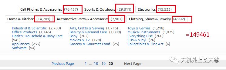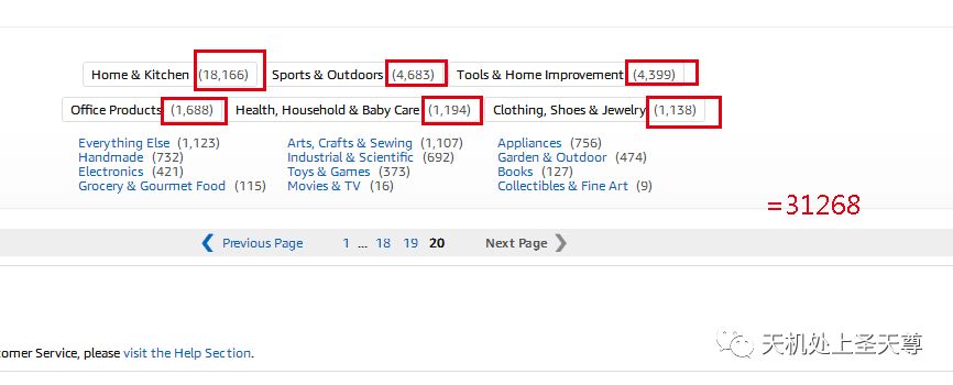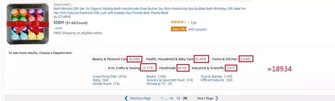 我们在亚马逊上搜索bath booms,显示16页10000个搜索量,其实是不准确的,我们需要点击所有品类,再翻到第二页,在网址一栏,改动两个地方:第一个地方是/ref=sr_pg_2,改成最后页数,一般是20页,第二个地方是“page= ”最后一页的页数,点击进入,看到有很多个大的类目,每个类目显示的产品数,将这些产品数相加就得到,这个产品市场预估值为 18934