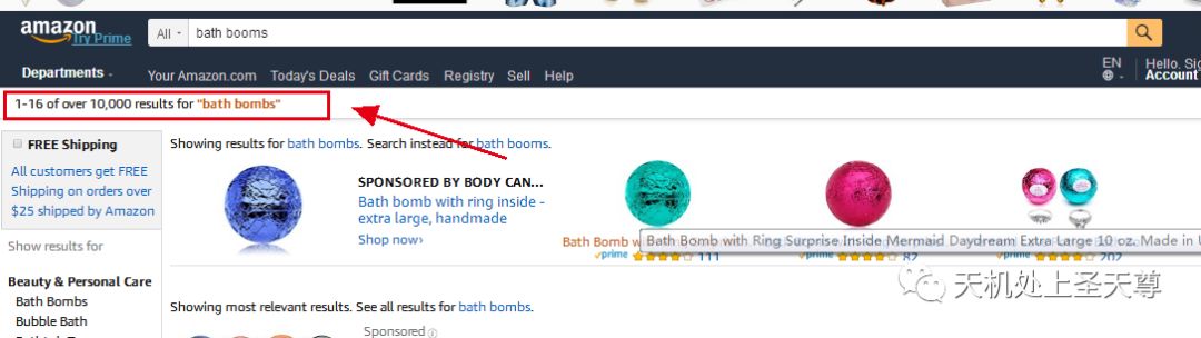 以前我们只需要在亚马逊首页的搜索框里输入产品关键词,就可以看到在售产品的数量,根据这个数量我们就可以预判市场,对这个产品的市场容量进行预估。但是,现在亚马逊前台不会再显示这个具体的数字,而是只会显示一个整数,一个大概的区间,这将对我们的预判带来困难,于是,我们百晓堂内部进行了测试和分析,最后整理出来了一种方法,具体如下:(以bath booms为例子)