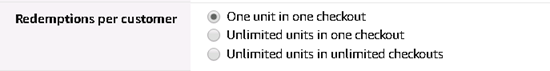 如果我们选择 one unit in one checkout ,那么我们可以将 code限制为一个 order只能允许一个 unit享受折扣,避免了一个订单购买多次产品重复享受折扣的情况发生,其实也相当于给一个 order 按金额减免了。当然也可以选择后面2个unlimited 的选项。这样的设置可以让我们按照自己的需求进行折扣设置。