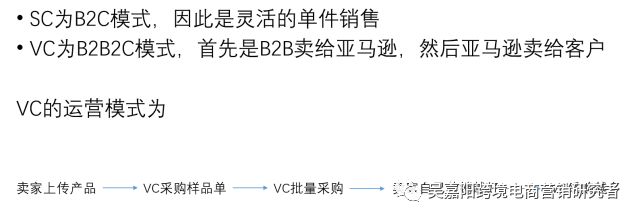 VC是B2B2C的电商模式,意思是供应商先将产品卖给亚马逊官方,亚马逊官方采购后再将产品卖家亚马逊marketplace上的消费者。