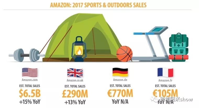 运动户外商品实际上组成了亚马逊最大最成熟的品类商品,美国亚马逊2017年的整体销售额据估算可能已经接近65亿美金,而欧洲几个重要站点,如英国亚马逊则获得了2.9亿英镑销售同比年增长达13%,德国站和法国站则分别取得7.7亿欧元和1.05亿欧元销售。