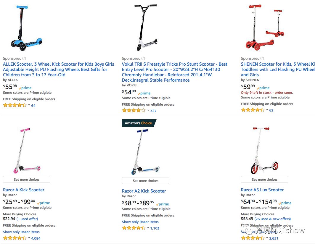 年轻世代消费者花费越来越多时间和金钱在网上购物,电动或非电动的平衡车则变得越来越普遍,两者都取得了超过40%的同比年增长,并组成了街头、冲浪滑雪品类近25%的销量。非电动平衡车甚至成为整个子类目第二大比例的品类商品。同时,消费者们都注意力则从滑轮运动一项结合了平衡车和滑板的电动滑板车系列。亚马逊电动滑板车品类最大的品牌Razor,在获得了投资人支持后,在包括传统的非电动平衡车、电动平衡车品类上都取得了快速增长,占据整个平衡车品牌卖家的超过50%的销量。