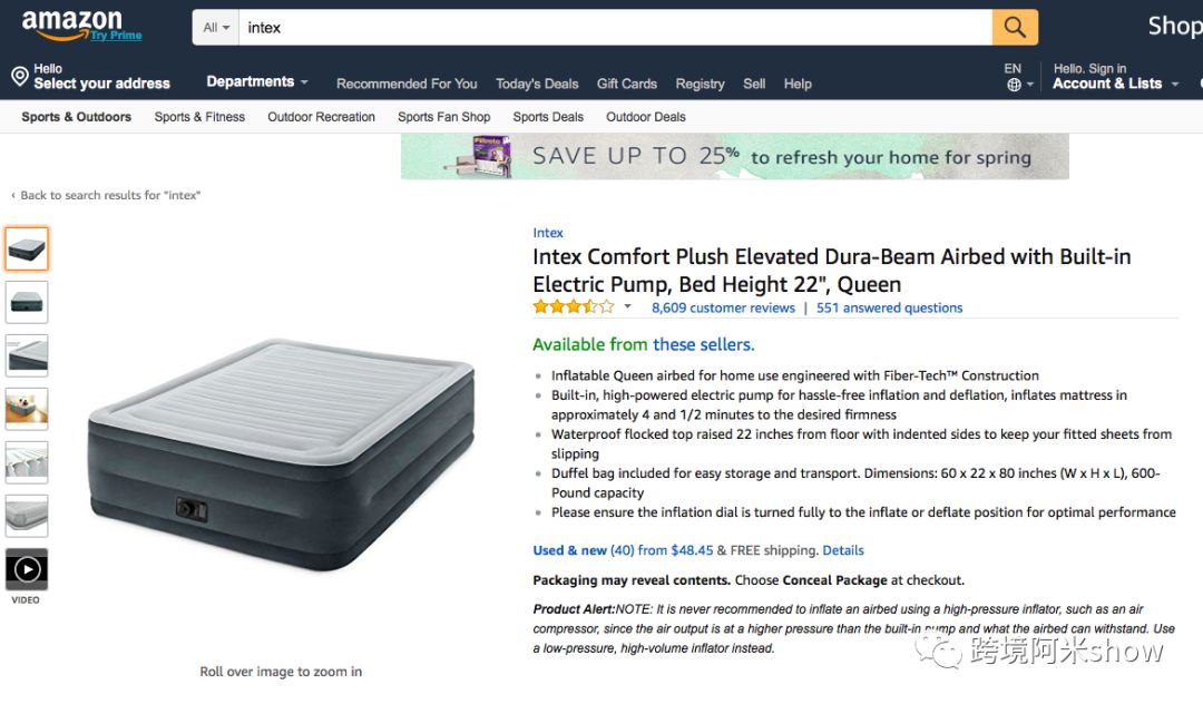 据数据显示2017年销量竟然达到越1.1亿美金,年同比增长高达22%。其中一个最闪耀的品类领袖,则是来自Intex的大号舒适型充气床垫。这单品在2017年一直雄霸整个运动户外品类充气床垫的前三位置而没有任何其他充气床垫曾进入了前25名。即使在发稿的当天,这个单品仍然是充气床垫品类排名第四的爆品。