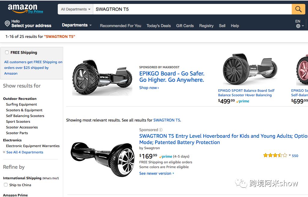 SWAGTRON T5的入门级平衡车在很长一段时间内都是街头、冲浪滑雪品类排行第一,而按照亚马逊一贯的品类归类,一般的常规平衡车是被归入Scooters – Electric 中。