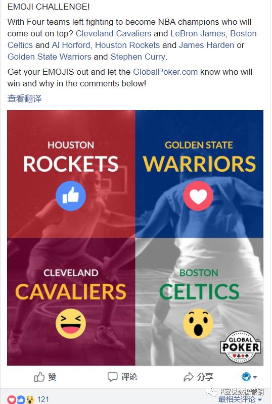 玩棋牌游戏的人一般都有博弈心理,所以广告主经常会发一些竞猜类的话题引发互动,NBA球赛就是他们常用的话题。