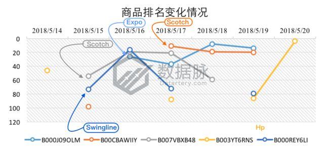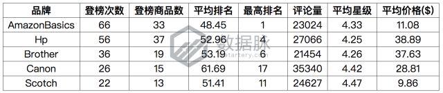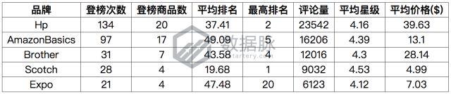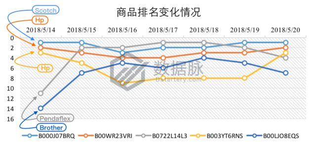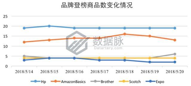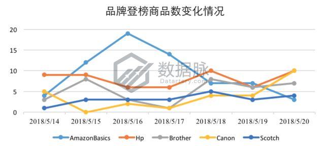 骆探长(shujumai.com)发现,在上周Office Products品类的Best Seller榜单中,总登榜排名前五的品牌并无新面孔,品牌Hp以一周登榜134次的表现继续领跑榜单;亚马逊的自营品牌AmazonBasics在上周的登榜商品数共17款,在5月18日与19日两天中分别登榜了16和15款商品;打印机周边产品品牌 Brother、胶带产品品牌Scotch与马克笔品牌Expo也在上周的榜单中保持稳定的发挥,分别位列品牌综合排名第三、四、五名。