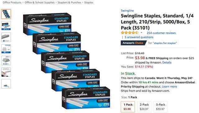 榜单综合第五的是来自Swingline的标准订书钉,该产品五盒装,一盒5000枚,声称可与大多数标准订书机匹配。