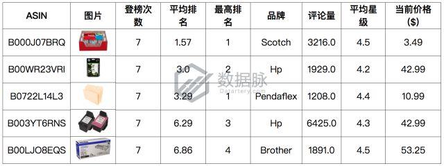 在上周Office Products品类的Best Seller榜单中排名前五中,骆探长(shujumai.com)发现,来自品牌Scotch的运输包装胶带产品已连续多期蝉联商品排行榜首,本期以平均排名1.57位居榜首;