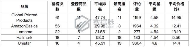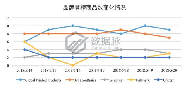 骆探长(shujumai.com)发现,在上周Office Products品类的Hot New Releases榜单中,亚马逊自营品牌AmazonBasics凭借56次的总登榜次数本期位列榜单第二,排名榜单第一的是以计划笔记本为主营产品的品牌Global Printed Products,该品牌本期有11款商品登榜,并总登榜61次,产品上架普遍较短(三个月内);同样主营计划笔记本的品牌Lemome本期上榜商品数逐步上升,并最终登榜5款商品,实现22次总登榜次数,位列品牌排名第三;以贺卡为主营产品的品牌 Hallmark和以便携标签机为主营产品的Unistar,也在上周取得了不错的榜单成绩,分别位列品牌综合排名第四、五名。