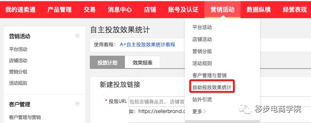 首先大家需要登录卖家后台,成功进入【A+计划-自主投放效果统计】入口。如下图: